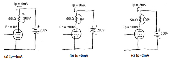 그림처럼 200V의 직류 전원을 이용해서 양극과 전원 사이에 50 kΩ의 저항을 삽입한 회로를 생각해 봅시다. 이 저항은 부하 저항이라고 합니다. 그러면, 아래 그림을 참조하여 양극 전류 Ip와 전압 Ep의 변화를 관찰해보면, 만약 Ip=40mA가 흐르면 부하 저항 양단의 전압은 옴의 법칙에 의해