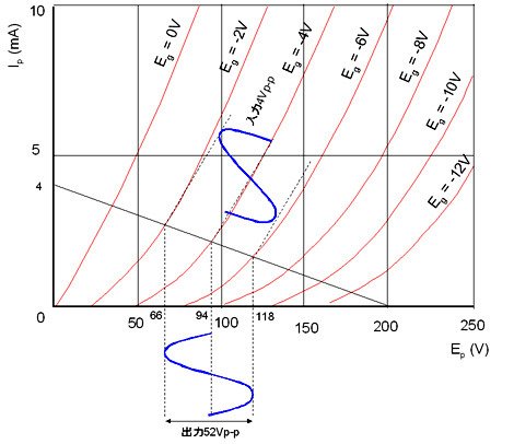 이번에는 Eg=-4V의 전압을 걸어보면, 부하선과의 교점은 100V의 좌측 옆으로 되어 Ep=94V라고 읽혀 지는데, 이제 그리드에 걸려있는 -4V에 아래 그림처럼 P-P치가 4V 인 교류를 중첩 시켜 입력 해 보면, 부하선과 특성 곡선의 교점에서 양극에 아래 처럼 거의 같은 형태의 교류 변화가 나타 납니다.