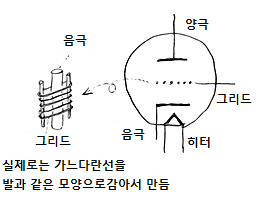 3극관은 그림처럼 2극관의 음극과 양극 사이에 망상의 그리드라고 하는 전극이 들어가 있는 것으로서, 실제로는 아주 가느다란 선을 발처럼 감아서 만들어져 있습니다.