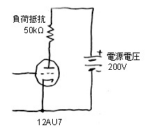 12AU7에 전원 전압 200V, 부하 저항50kΩ을 사용한 때의 로드라인