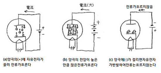그림(a)와 같이 음극에 대해 양극에 플러스의 전압을 가하면,음극 내의 전자가 양극의 플러스 전위에 이끌려 음극판에서 공간 중으로 날아 올라 양극으로 끌려 갑니다. 이렇게 하여 일정량의 전자가 음극에서 플레이트(양극)로 향하여 진공을 통해 날아가서 전자의 흐름이 이루어져 결국 플레이트에서 캐소드로 전류가 흐르게 되는 것 입니다. 전자와 전류는 방향이 반대이므로 양극에서 캐소드를 향해 전류가 흐른다고 하는 것입니다.