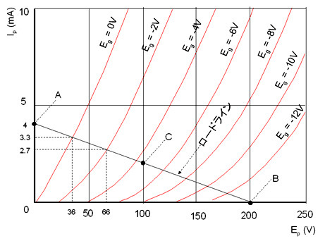 12AU7에 전원 전압 200V, 부하 저항50kΩ을 사용한 때의 로드라인 3극관에 의한 전압 증폭과 바이어스 이렇게 만든 부하선을 보면, 부하선과 진공관의 특성 곡선(적색선)에 몇개의 교점이 있는데 이것이 이 회로에서의 진공관의 동작점 입니다.