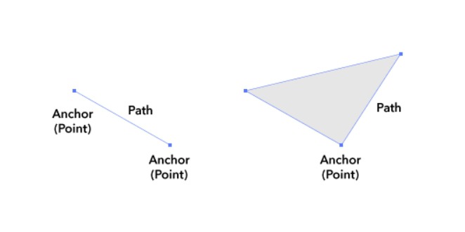 벡터 방식의 그래픽은 다음과 같은 메커니즘으로 구성됩니다. 일단 두 개의 점point이 연결되면 하나의 선path이 됩니다. 그리고 그 선path이 세 개 이상이 되면 면을 만들 수 있습니다. 그리고 각각의 선은 두께 값과 색상 값, 곡률 값을, 면은 색상 값을 가질 수 있습니다. 이렇게 점과 선, 면의 기본적 벡터 그래픽 요소들이 모여 다양하고 복잡한 벡터 그래픽을 만들 수 있게 됩니다.