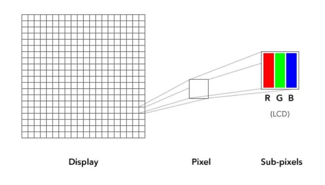 하나의 픽셀은 R빨강, G초록, B파랑의 세 가지의 서브 픽셀subpixel로 이루어져 있습니다, 서브 픽셀의 배열 방식은 디스플레이의 특성에 따라 모두 다릅니다. 서브 픽셀의 배열 방식의 차이는 너무 깊은 얘기이니 본편에서는 다루지 않기로 하겠습니다. 참고로 보편적으로 가장 많이 쓰이고 있는 LCD 방식은 그림에서와 같이 RGB가 하나의 픽셀을 이루어 전체 디스플레이에 배열이 연속됩니다.