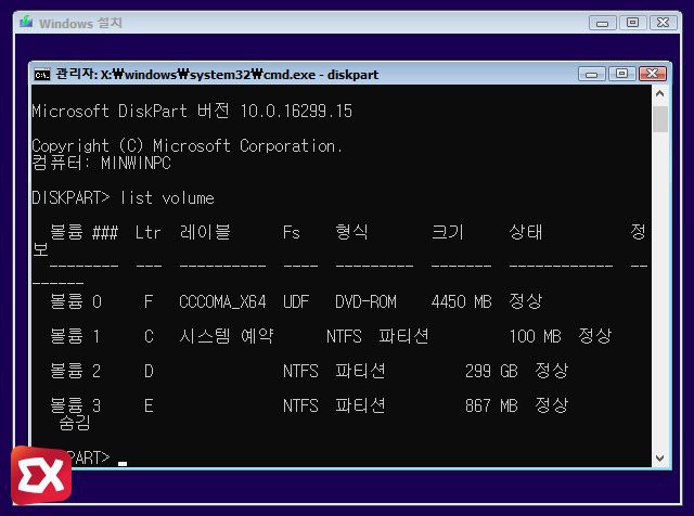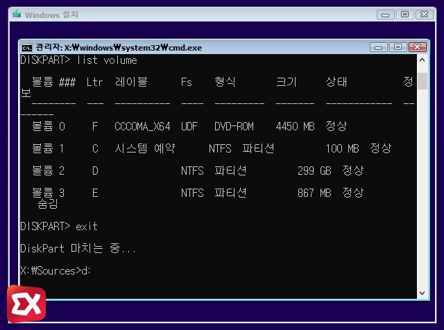 윈도우가 설치된 드라이브를 확인했으면 exit 명령어로 diskpart를 종료합니다.