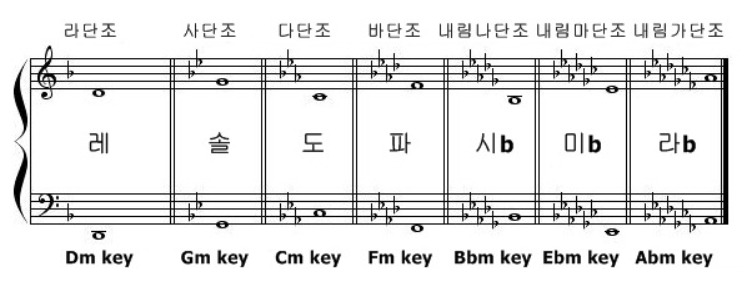 위 그림들을 잘 살펴 보셨나요? 각 조들은 그 종류에 따라 플랫이나 샵이 한개 붙기도, 두개 붙기도, 여러개씩 붙기도 합니다. 그리고 이렇게 붙은것들을 '무슨키 무슨키' 하는식으로 키(Key)라고 부르는데요, 어려울 것 없이 마이너(m) 소문자'엠'이 뒤에 붙어있는 키는 '디마이너 키' '이플랫마이너키' 하는 식으로 불러주면 되구요, 메이저(M) 대문자'엠'이 뒤에 붙어있는 것들은 '씨메이져 키' '에이메이져 키' 하는 식으로 불러주시면 됩니다. 아니면 좀 더 편하게 메이저키의 경우 '씨키' '디키' 하는식으로 불러주셔도 되구요.