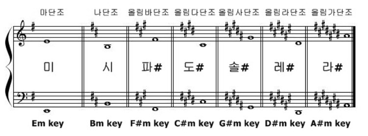 이렇게 붙어있는 조표들에 의해 곡의 키(key)가 정해지게 되는데요, 그럼과 동시에 이게 메이저(M)곡인지, 마이너(m)곡인지도 알 수 있게 됩니다.
