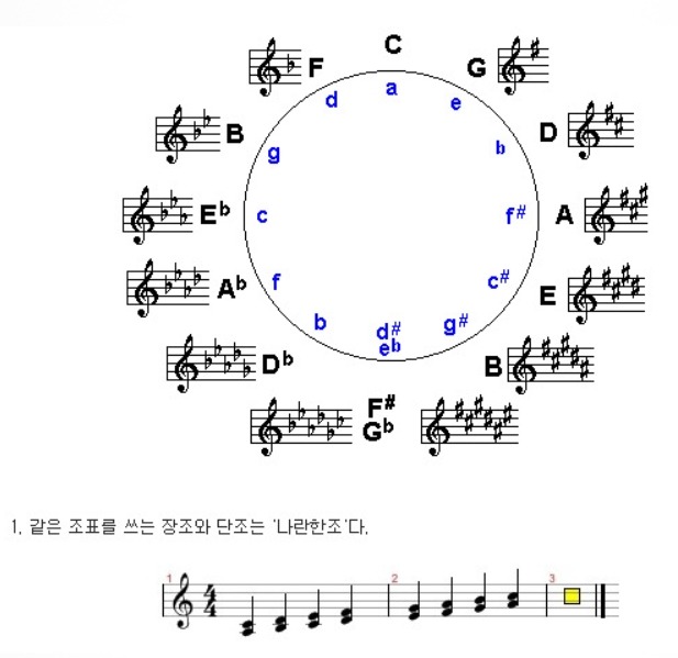 이 조와 조표 모음에는 메이저조와 마이너조라는 크게 두가지 종류가 있습니다. 장조와 단조 이지요. 많이 들어보셨을 텐데요. 그러한 만큼 이번 게시글에서 나가는 내용은 앞으로 나갈 장음계, 단음계, 5도권, 테트라코드등 여러 내용들과 밀접한 관련이 있으니 간단하게 나가더라도 앞으로를 위해 기억해 두시기 바랍니다.