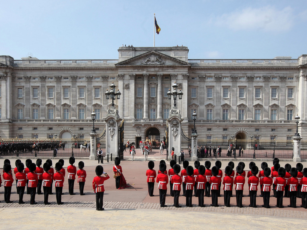 영국의 명물이자 중요한 관광 이벤트인 근위병 교대식은 4월에서 7월까지는 매일 1회, 나머지 철에는 2일에 한 번씩 오전 11시 혹은 11시 30분에 열린다. 근위대는 척탄병 근위대(Grenadier Guards), 콜드스트림 근위대(Coldstream Guards), 스코트인 근위대(Scots Guards), 아일랜드인 근위대(Irish Guards), 웨일스인 근위대(Welsh Guards) 등 다섯 부대로 구성되어있다. 근위대는 검은색으로 보일 정도의 짙은 남색깃을 단 붉은색 상의에 검은 곰털로 만든 둥근 통 모양의 모자를 착용한다. 계급이나 부대는 모자의 왼쪽이나 오른쪽에 꽂는 털색과 상의의 단추배열 등으로 구분된다. 특히 왕의 생일에 거행되는 가장 화려한 사열식을 트루핑 더 컬러(Trooping the Color)라고 한다.