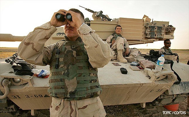이라크 전에서 카오스 컴패니 군인들이 사마라에 위치한 브라스필드 캠프에서 폭발물 제거 작업을 하고 있다. (2005. 1. 1.)