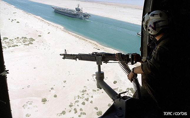 수에즈 운하를 지나는 미 해군 항공 모함 ‘아이젠하워(USS Eisenhower)’를 헬리콥터에서 엄호하고 있다(1990. 8. 22.)