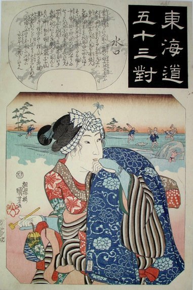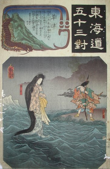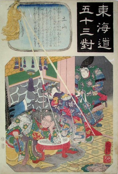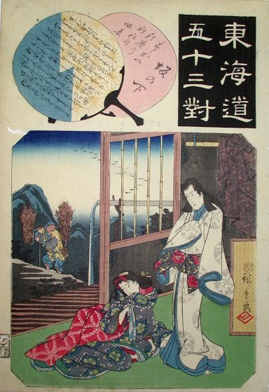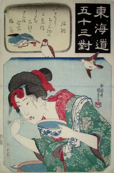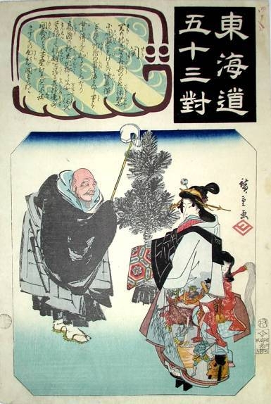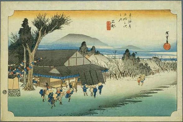 옛적에 한 화가가 이 곳의 絶景을 그리려고 하였다. 너무도 아름다워서 생각대로 그릴수가 없었다. 결국은 그리는 것을 그만두고 그림그리던 붓을 던져 버렸다고 한다. 이것이 筆捨山의 유래이다. 여행객이 찻집앞에서 <절경이구나>하고 경치를 바라보고 있다. 스즈카(鈴鹿)산을 넘으면 이제 다음 역참 土山이다.