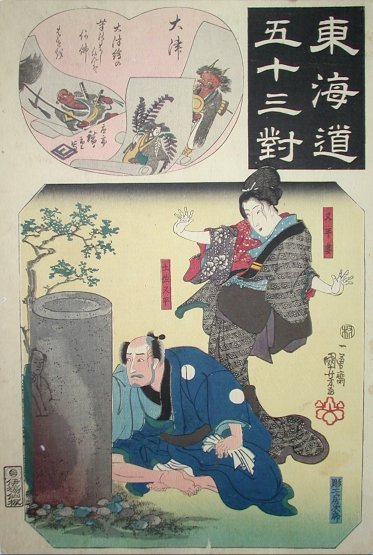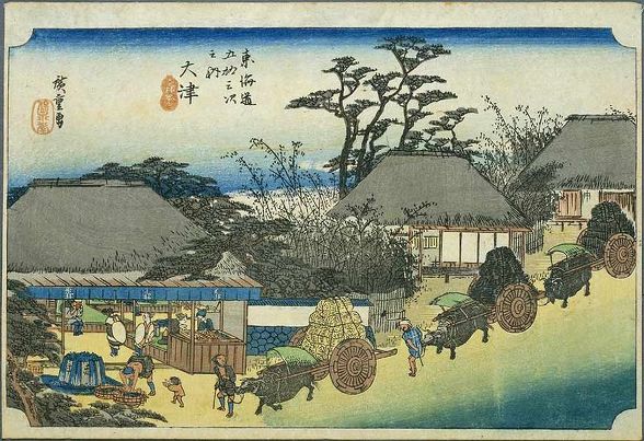 어느덧 오오츠다. 관동지역과 달리, 관서지방은 소가 짐을 운반하는데 자주 사용된다. 관동에서는 거의 말이고, 소는 보이지 않는다. 이 소는 이곳이 교토 부근임을 나타내주고 있다.