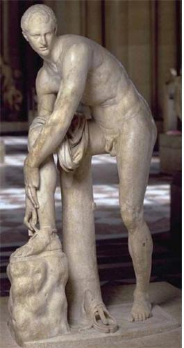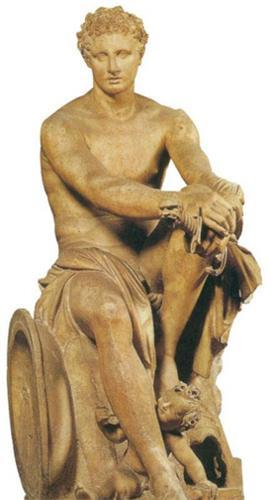 ◆ 아레스 ☞ 전쟁의 신.제우스와 헤라의 아들로 그는 갑옷을 입고 투구를 쓰고 방패를 갖고 창과 칼을 휴대하고 있습니다. 호전적이었으나 아름다운 모습을 가진 청년으로, 여신 아프로디테의 사랑을 받아 그녀의 애인이 되었습니다. 그의 주위에는 걱정의 신 데이모스, 공포의 신 포보스, 불화의 신 에리스, 그리고 싸움의 여신 에니오가 따르고 있습니다.