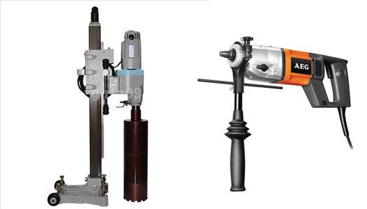 ▼ 코어 드릴 : 콘크리트나 석재에 20mm 이상의 구멍을 타공할 때 사용하는 드릴로 물을 사용하는 습식 코어 드릴(사진의 왼쪽)과 물을 사용하지 않는 건식 코어 드릴(사진의 오른쪽)이 있다. 에어컨 설치 업체가 가지고 다니는 드릴이 주로 건식 코어 드릴이다. 건식 코어는 습식 코어보다 천공능력도 떨어진고 사람의 힘으로 컨트롤하므로 작업자가 엄청 힘들고 위험하지만 진공 청소기만 있으면 주변을 깨끗하게 정리할 수 있다. 습식은 일단 커서 이동이 어렵고 물을 사용하기에 주변에 흙탕물이 엄청나게 튄며 벽이나 바닥에 앵커를 박고 습식 코어를 고정시킨 후 작업을 해야 하므로 마감이 완벽히 된 장소에는 사용하기 힘들다. 그러나 일단 타공 위치에 습식 코어를 설치만 하면 타공작업 자체는 건식보다 훨씬 쉽고 안전해서 100mm 이상의 대구경 천공에 많이 쓰인다.