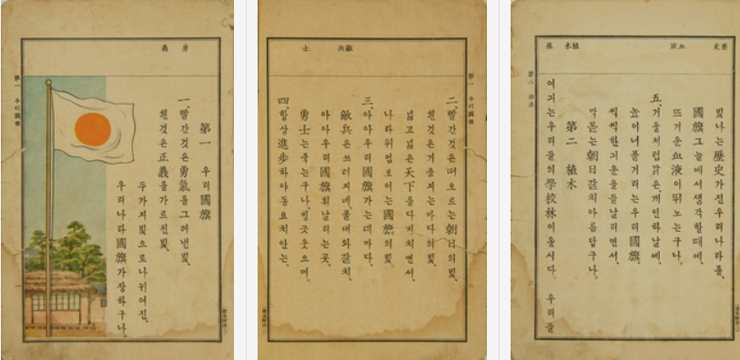 셋, 아아 우리 국기 가는 데마다 적병은 쓰러지네, 풀대와 같이. 아아 우리 국기 휘날리는 곳. 용사는 죽는구나, 빙긋 웃으며.