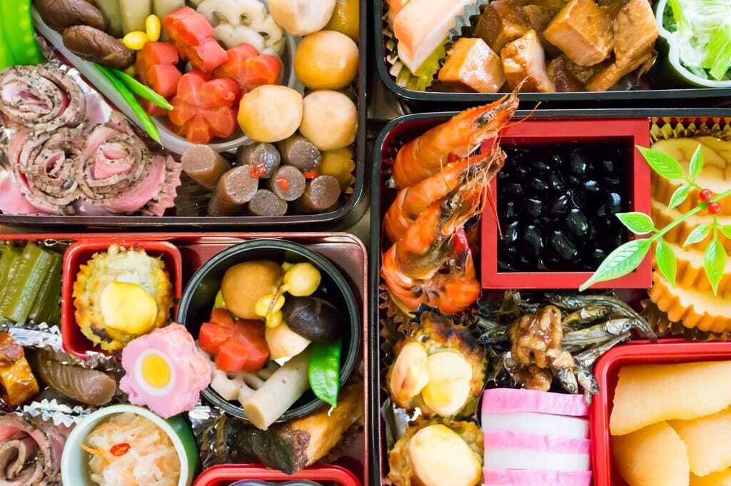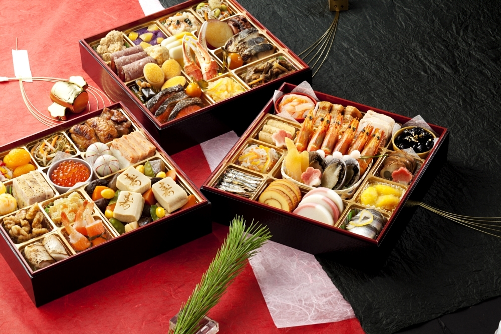 ‘도시가미(年神, 그 해의 풍작을 비는 신)에게 바치는 공물’ 및 ‘가족의 번영을 기원하는 요리’라는 의미를 갖는 오세치. ‘복과 경사를 쌓아 올린다’라는 뜻을 담아 찬합에 넣어 제공된다. 정식적으로는 5단으로 쌓는 것인데 1번째 단부터 4번째 단까지 요리를 담고 5번째 단은 비워 둔다. 이는 도시가미로부터 받을 복을 넣는 공간을 비워두어야 하기 때문이다. 최근에는 3단 찬합이 일반적이다. 또한 찬합의 각각의 단에 넣는 요리의 종류는 정해져 있으며 5종류, 7종류, 9종류와 같이 길수(吉数)로 담으면 재수가 좋다고 한다.