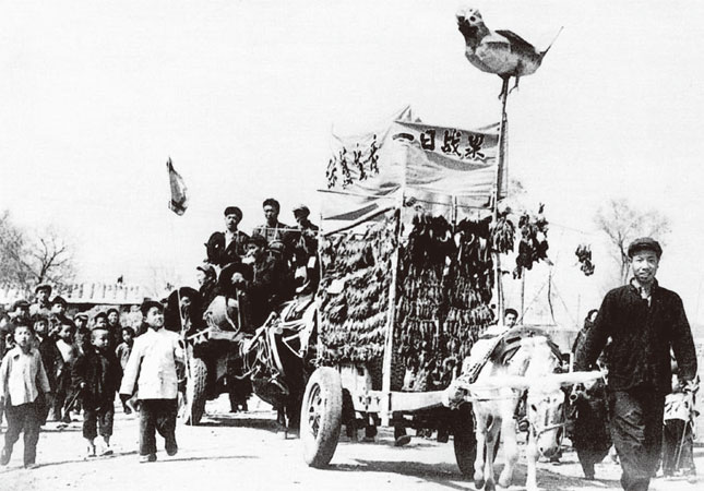 잡은 참새를 달구지에 매달고 거리에서 축제를 벌이고 있는 중국 인민들. 일일전과(一日戰果)란 글귀에서 짐작할 수 있듯, 저 수많은 참새를 단 하루 만에 잡았다. 이런 짓거리를 전 대륙에서 1958년 한 해 동안 계속했다.