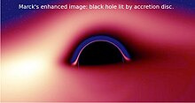 질량이 큰 천체로 인해 생성된 중력 우물로 낙하하는 기체는 각운동량 보존에 의해, 그 천체 주위로 원반 모양의 구조를 형성하게 된다. 보통 천체예술가들의 상상도에 그려지는 강착원반을 가진 블랙홀은 왼쪽 상상도처럼 마치 원반이 평면적 존재이고 블랙홀 뒤의 원반은 블랙홀에 의해 가려지는 것처럼 묘사되곤 한다. 그러나 보다 정확한 수학적 모형은 블랙홀 뒤쪽의 원반에서 나오는 빛의 경로가 왜곡됨으로써 어느 쪽에서 보아도 원반의 전체 모양이 보일 것이고, 또 원반 아래쪽의 2차 상이 부분적으로 보일 것이라고 예측하고 있다.