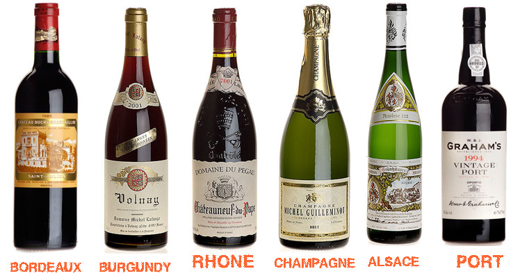 - 샴페인: 샹파뉴 지방에서 만든 스파클링 와인. 다음과 같은 과정으로 만들어진다. 세간에서 샴페인이라고 파는 건 거의 다 가짜고, 프랑스 샹파뉴 지방에서 만든 와인만 샴페인이라는 이름을 붙일 수 있다.(심지어는 광고문구에 "이 가격에 구매하시면 스파클링 가격이 샴페인을 사시는 것과 같습니다!"라고 적었다고 태클이 들어온다!) 나머지는 그냥 스파클링 와인이므로 구매 시 주의를 요한다. 포도 수확 뒤 특별한 통 속에서 1차 발효하고 병 속에 넣고 당분, 향신료를 넣어 2차 발효하는 과정을 거친다.