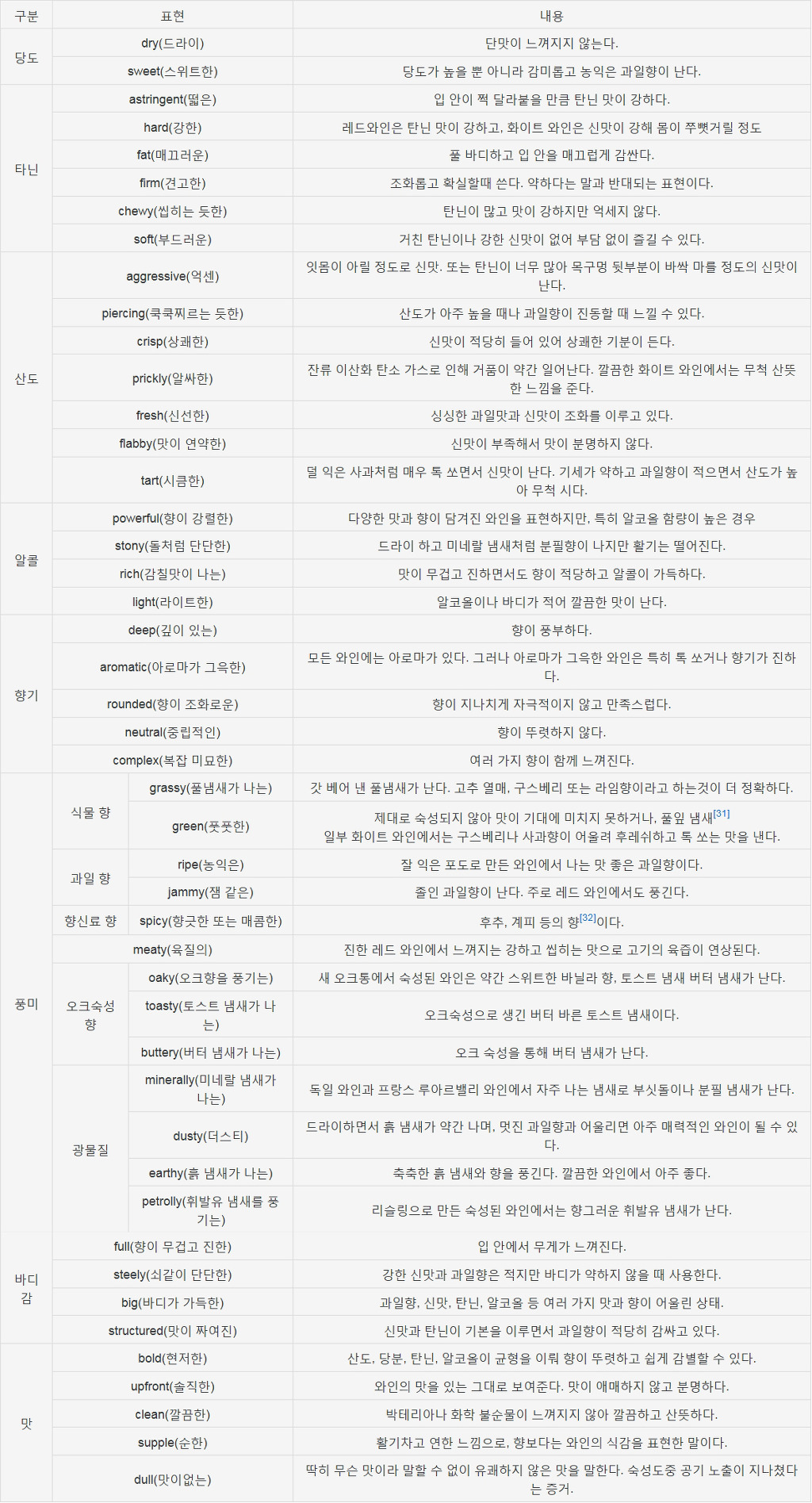 • 테이블 와인: 식사 중에 메인음식과 함께 곁들이고, 14%내외의 알콜함량을 가진 와인을 말한다.