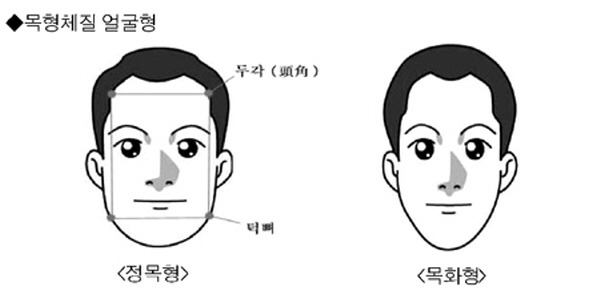 목형 체질을 가진 사람의 얼굴은 직사각형(정목형)이 있는가 하면 목화형(木火型)이 있는데 이는 얼굴이 길면서 이마부위가 넓은 사람을 말한다.