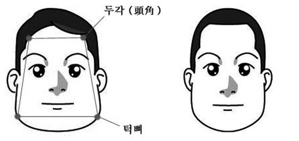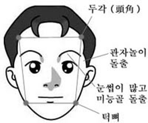또한 얼굴 모양이 삼각형을 세워 놓은 것처럼 턱(귀밑)이 넓고 이마는 좁다. 이런 유형은 신·방광이 실하고 큰 반면 심·소장은 약하다.