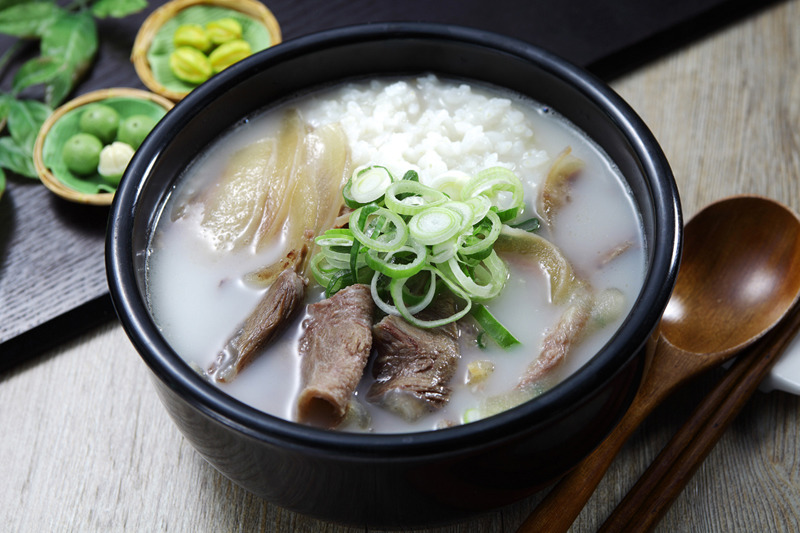 소의 머리고기, 사골, 우거지, 토란줄기, 무 등을 넣고 푹 곤 곰국밥. 국물이 설렁탕보다 진하고 시원하다.
