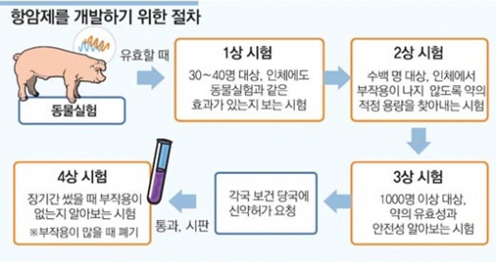 새로운 약물을 개발하여 전임상실험에서 효능과 안정성을 확인하게 되면, 직접 사람을 대상으로 임상시험을 수행하게 됩니다. 임상시험이란 사람을 직접 연구대상으로 하여 약물의 효능과 안전성을 평가하는 실험적연구를 말하며 주로 새로운 치료방법의 효과를 평가하고자 할 때 시행됩니다. 임상시험은 영장류 등 동물을 대상으로 한 전임상시험(Preclinical study)을 통과한 후보 약물을 대상으로 이뤄집니다.