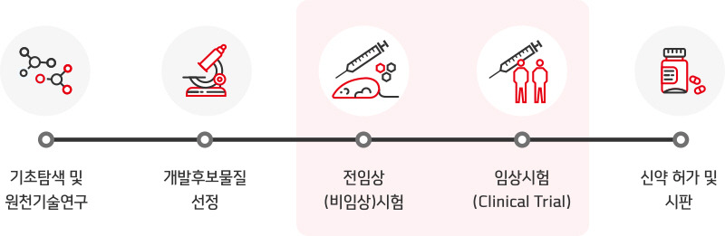 둘째 단계는 최종 목표인 인간에게 약물을 투여하기 전, 동물실험을 통하여 약물의 효능과 안전성을 평가하는 전임상시험(Preclinical study) 단계입니다.