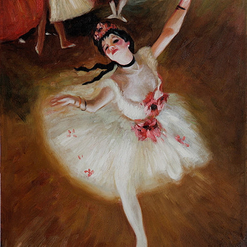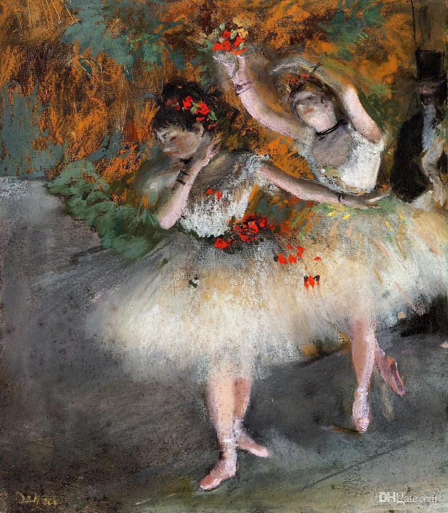 초기의 화풍은 고전적으로 <보나의 초상> <꽃을 든 여인> <이오 부인> 등의 초상화에서 출발했으나, 차츰 무용, 극장 등의 근대적 민중 생활의 묘사를 시작했다. 움직이는 것의 순간적인 아름다움을 포착하여 그리는 독자적인 수법을 썼다. 특히, 보는 각도를 바꾸어 가면서 정확한 데생과 풍부한 색감을 표현하였다. 무희를 모델로 한 작품이 많아 '무용의 화가'로 불린다. 주요 작품으로 <댄스 교습소> <국화 옆의 여인> 등이 있다. 당시 드가의 이런 소재 선택은 꽤 파격적인 편인데, 당시만 해도 무용수들의 처우는 매춘부보다 약간 나은 수준이라 할 정도의 하층민이었기 때문이었다. 당시 발레리나는 발레를 신분상승의 수단으로 보고 귀족들에게 후원을 받는 하층민 출신의 소녀들이 대부분이었다. 귀족들은 예술로서의 발레가 아닌 발레리나에 투자를 했을뿐이고 자신이 후원하는 발레리나가 등장할때 무대의 뒤편에서 관람하거나 무대가 아닌 다른곳에서 보는 특권을 받았다. 그러나 이는 후원의 표면적인 이유였고 사실 무대의 안쪽에선 어린 발레리나들이 후원하는 귀족에게 성상납을 하는일이 비일비재했다.