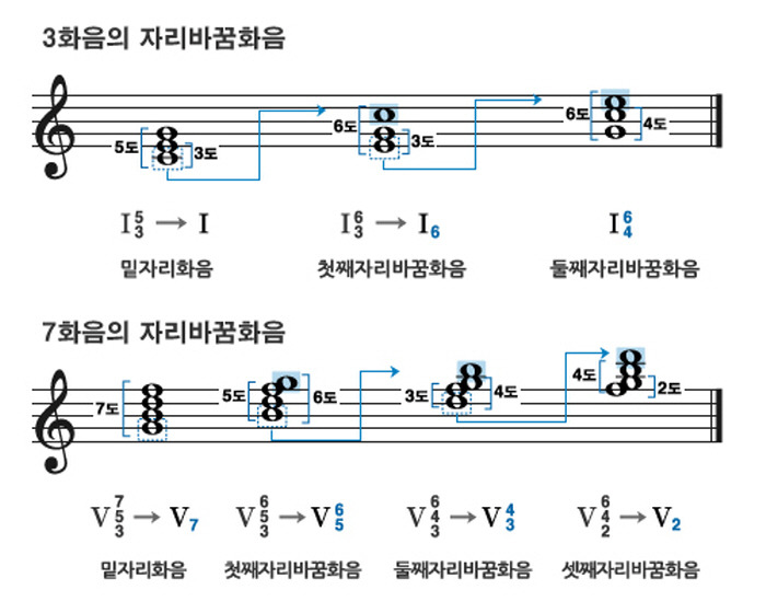 또 화음의 밑음이 가장 낮은 자리에 오는 것을 밑자리라고 하며 낮은 음 이외에 밑음이 오는 것을 자리바꿈화음이라고 한다. 3화음에는 6화음과 4 ·6화음의 두 가지 자리바꿈이 있고, 7화음에는 5 ·6화음, 3 ·4화음, 2화음 등 세 가지의 자리바꿈이 생긴다.