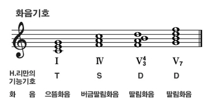 이와 같은 화음의 종류나 위치를 문자나 숫자로 나타내는 일이 18세기 이래 여러 가지로 고안되어 왔으나, 현재도 사용되는 가장 일반적인 것은 고트프리트 베버의 고안(1817)을 기초로 한 것이다. 이에 의하면 알파벳의 대문자로 장조, 소문자로 단조를 나타내고, 화음은 그 밑음이 음계 속에서 차지하는 도수에 따라 로마숫자로 나타내며 그것에 아라비아숫자를 덧붙여서 자리바꿈이나 7화음 등을 나타낸다. 이 방법에 H.리만의 기능기호인 으뜸화음을 나타내는 T, 딸림화음을 나타내는 D, 버금딸림화음을 나타내는 S가 병용되고 있다.