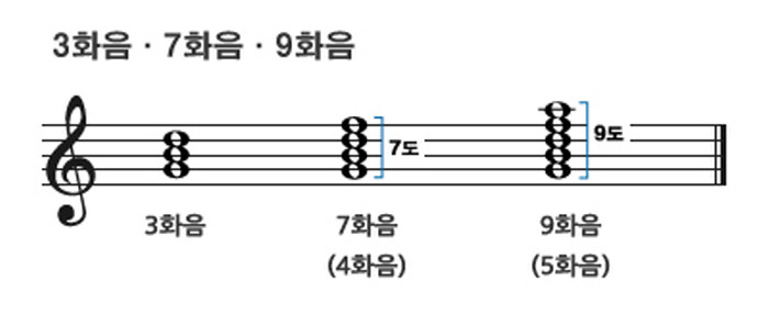 장조와 단조에 의한 이른바 조성적(調性的) 화성법에서는 3도의 간격으로 3개의 음을 겹친 3화음이 기초적인 화음을 이루고 있으나 때로는 2개의 음만으로 화음의 의미를 나타내기도 한다. 4개의 음으로 된 화음을 4화음, 5개의 음으로 된 화음을 5화음이라 부르기도 하나 3도씩의 겹침에 따라 밑음과 가장 위의 음 사이가 7도가 되는 것을 7화음, 9도가 되는 것을 9화음이라고 하는 것이 보통이다.