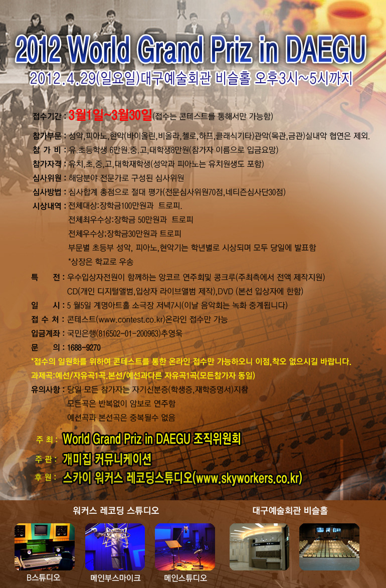 참가부문:성악,피아노,현악(바이올린,비올라,첼로,하프,클래식기타)관악(목관,금관)실내악 협연 은 제외.