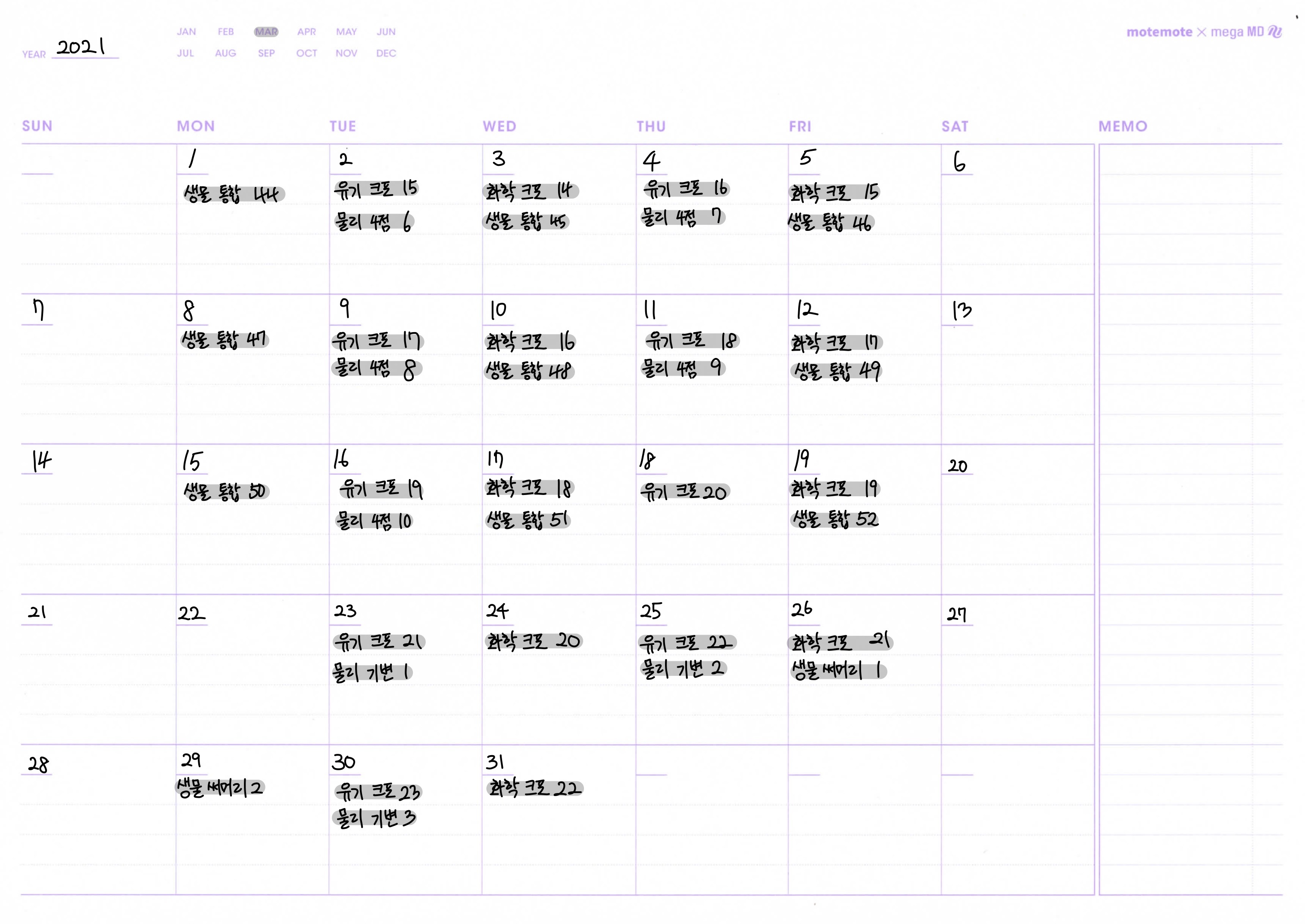 인강 진도가 밀리지 않는 것이 가장 중요하다고 생각했습니다. 보통 현장강의가 진행되고나면 다음날 강의가 업로드 되는데, 이를 고려해서 미리 한달 정도의 인강 수강 계획을 세웠습니다. 학원 홈페이지를 확인해서 개강 일자, 강의 업로드 요일등을 파악할 수 있습니다. 월말에 그 다음달 수강 계획을 세우고, 만약 밀리는 경우가 있더라도 최대한 그 주 주말을 이용해 수강하여 다음주까지 밀리지는 않도록 관리했습니다. 하루 공부를 마친 후 다음 날의 플래너를 작성했고, 하루 4과목을 모두 공부할 수 있도록 했습니다.