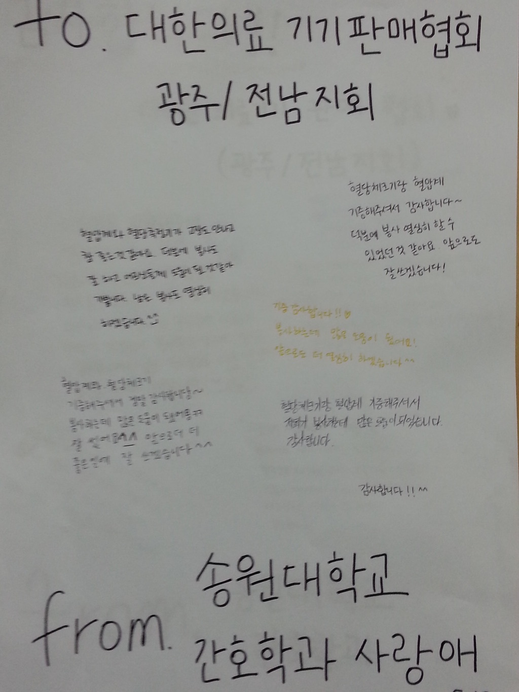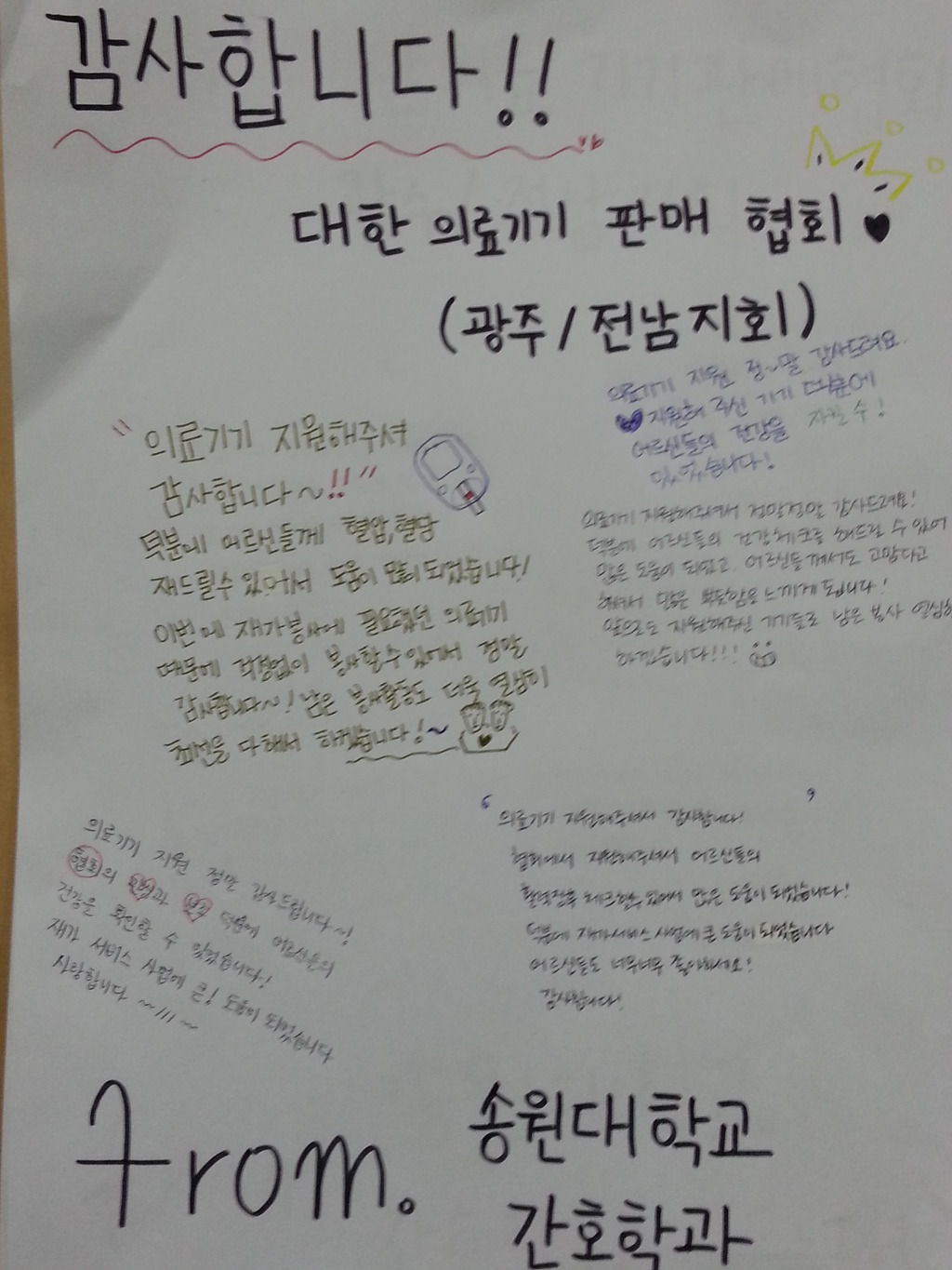 송원대학교 간호학과 학생들의 감사 롤링페이퍼 작성자한울노인복지센터|작성시간13.11.22|조회수796 목록 댓글 0 글자크기 작게가 글자크기 크게가 송원대학교 간호학과 학생들이 후원해주신 의료기기로 활동을 원활하게 할 수 있었다며 감사의 뜻을 전해왔습니다^^ 다음검색 현재 게시글 추가 기능 열기 북마크 공유하기 신고 센터로 신고 댓글 댓글 0 댓글쓰기 댓글 리스트