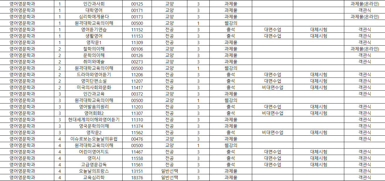 그 외 타학과의 영어과목; 무역학과 3학년 무역영어 3학점 중간 과제물 기말 객관식 시험, 도시콘텐츠 관광학과 1학년 여행영어1 3학점 중간 출석 대면수업 기말 객관식 시험