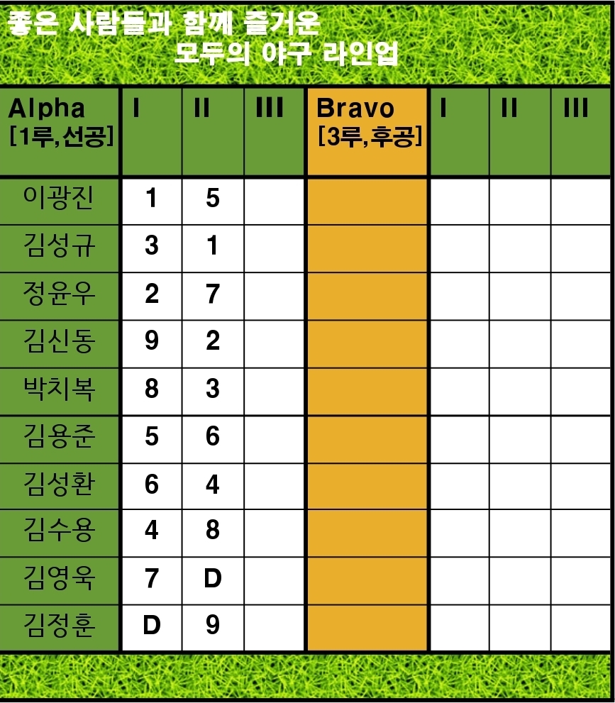 4월 4일 라인업 작성자기재형76[남악 브런치]|작성시간26.04.04|조회수150 목록 댓글 1 글자크기 작게가 글자크기 크게가 서로 배려하며 성실한 플레이로 함께성장하는 경기가 되길 바랍니다 다음검색 현재 게시글 추가 기능 열기 북마크 공유하기 신고 센터로 신고 댓글 댓글 1 댓글쓰기 답글쓰기 댓글 리스트 작성자기재형76[남악 브런치] 작성자 본인 여부 작성자 | 작성시간 26.04.04 모야 vs 다이아몬드A 1. 2. 2. 0. 0. 7. B 0. 0. 0. 2. 8. 4. 댓글 전체보기