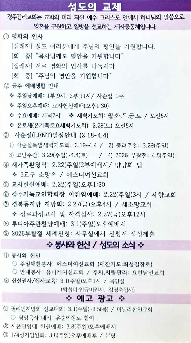 2/22 교회소식 작성자최성길/장로|작성시간26.02.24|조회수9 목록 댓글 0 글자크기 작게가 글자크기 크게가 다음검색 현재 게시글 추가 기능 열기 북마크 신고 센터로 신고 댓글 댓글 0 댓글쓰기 답글쓰기 댓글 리스트