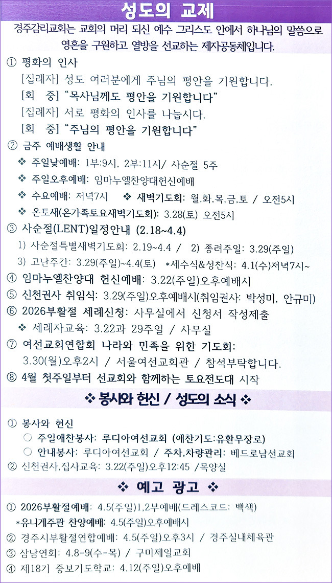 3/22 교회소식 작성자최성길/장로|작성시간26.03.26|조회수15 목록 댓글 0 글자크기 작게가 글자크기 크게가 다음검색 현재 게시글 추가 기능 열기 북마크 신고 센터로 신고 댓글 댓글 0 댓글쓰기 답글쓰기 댓글 리스트
