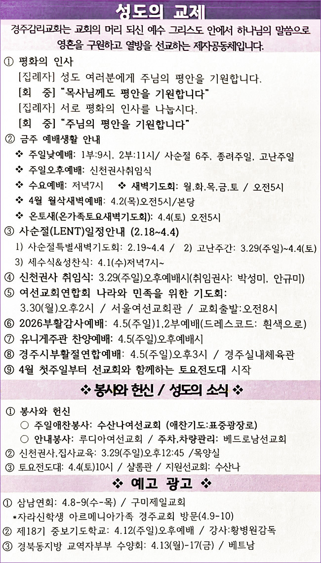 3/29 교회소식 작성자최성길/장로|작성시간26.03.30|조회수15 목록 댓글 0 글자크기 작게가 글자크기 크게가 다음검색 현재 게시글 추가 기능 열기 북마크 신고 센터로 신고 댓글 댓글 0 댓글쓰기 답글쓰기 댓글 리스트