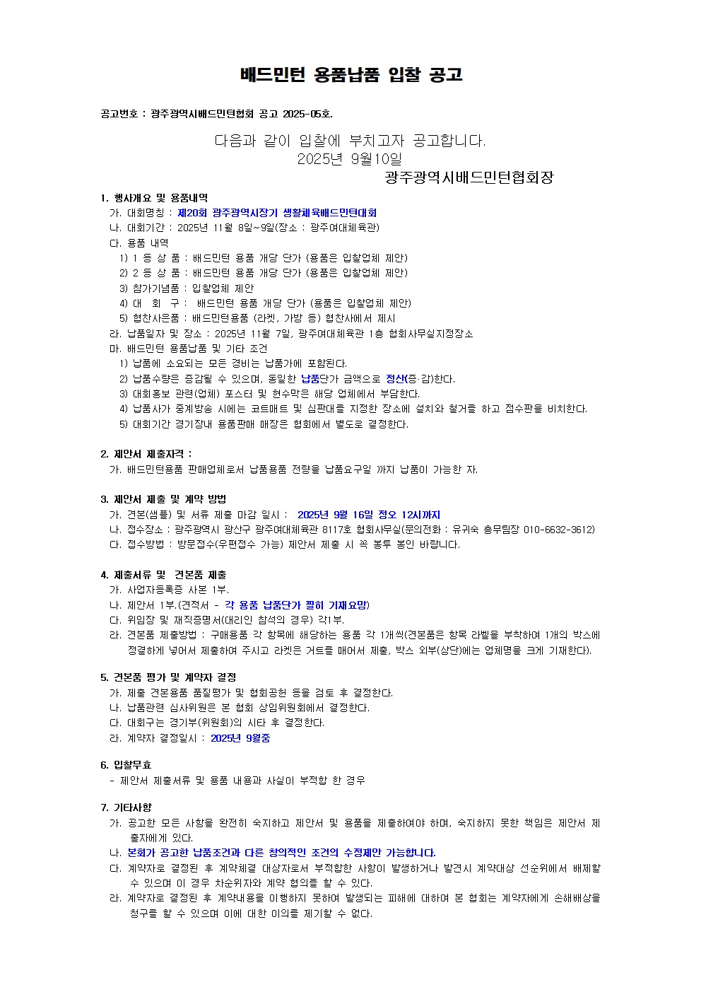 제20회 광주광역시장기 생활체육배드민턴대회 입찰공고 작성자유귀숙 /시협회 총무/북구/전대모아|작성시간25.09.10|조회수427 목록 댓글 0 글자크기 작게가 글자크기 크게가 다음검색 현재 게시글 추가 기능 열기 북마크 신고 센터로 신고 댓글 댓글 0 댓글쓰기 답글쓰기 댓글 리스트