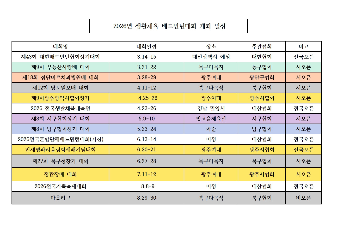 2026년 대회일정 수정(제8회 남구협회장기 일정수정) 작성자유귀숙 /시협회 총무/북구/전대모아|작성시간26.01.21|조회수330 목록 댓글 0 글자크기 작게가 글자크기 크게가 다음검색 현재 게시글 추가 기능 열기 북마크 신고 센터로 신고 댓글 댓글 0 댓글쓰기 답글쓰기 댓글 리스트