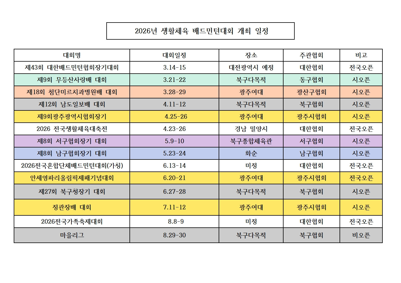 2026년 대회일정 수정(서구협회장기 장소 수정) 작성자유귀숙 /시협회 총무/북구/전대모아|작성시간26.01.27|조회수794 목록 댓글 0 글자크기 작게가 글자크기 크게가 다음검색 현재 게시글 추가 기능 열기 북마크 신고 센터로 신고 댓글 댓글 0 댓글쓰기 답글쓰기 댓글 리스트