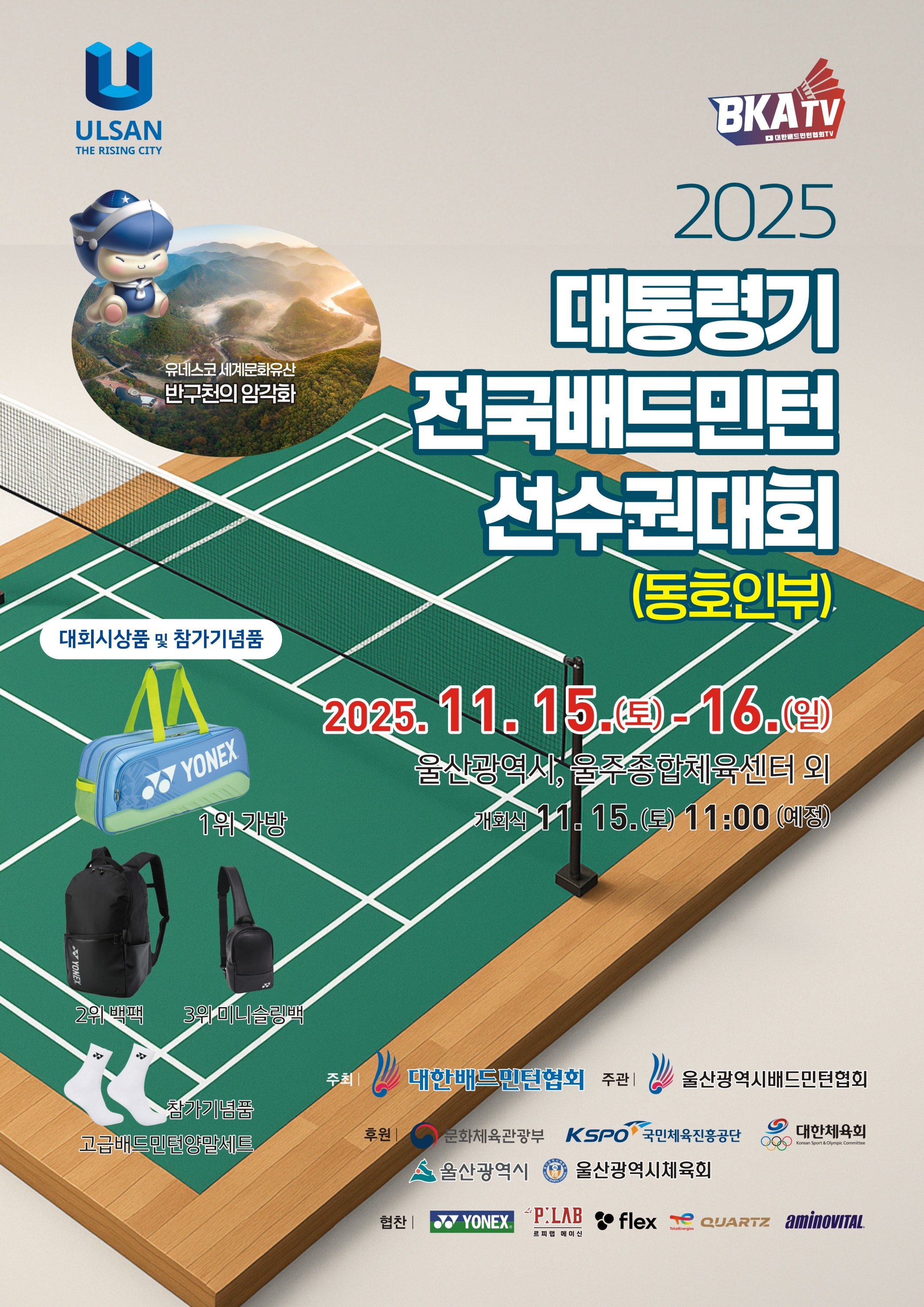 2025 대통령기 전국배드민턴 선수권대회(동호인부) 작성자신준승/광산구/송정|작성시간25.10.06|조회수281 목록 댓글 0 글자크기 작게가 글자크기 크게가 2025 대통령기 배드민턴대회 _동호인부 대회요강.hwp763.00KB 첨부파일첨부된 파일이 2개 있습니다. jpg 파일 2025 대통령기 전국배드민턴선수권대회- 동호인부 포스터.jpg 다운로드 hwp 파일 2025 대통령기 배드민턴대회 _동호인부 대회요강.hwp 다운로드 다음검색 현재 게시글 추가 기능 열기 북마크 신고 센터로 신고 댓글 댓글 0 댓글쓰기 답글쓰기 댓글 리스트