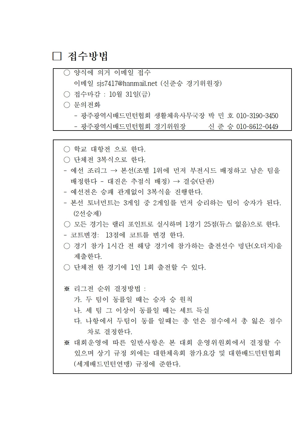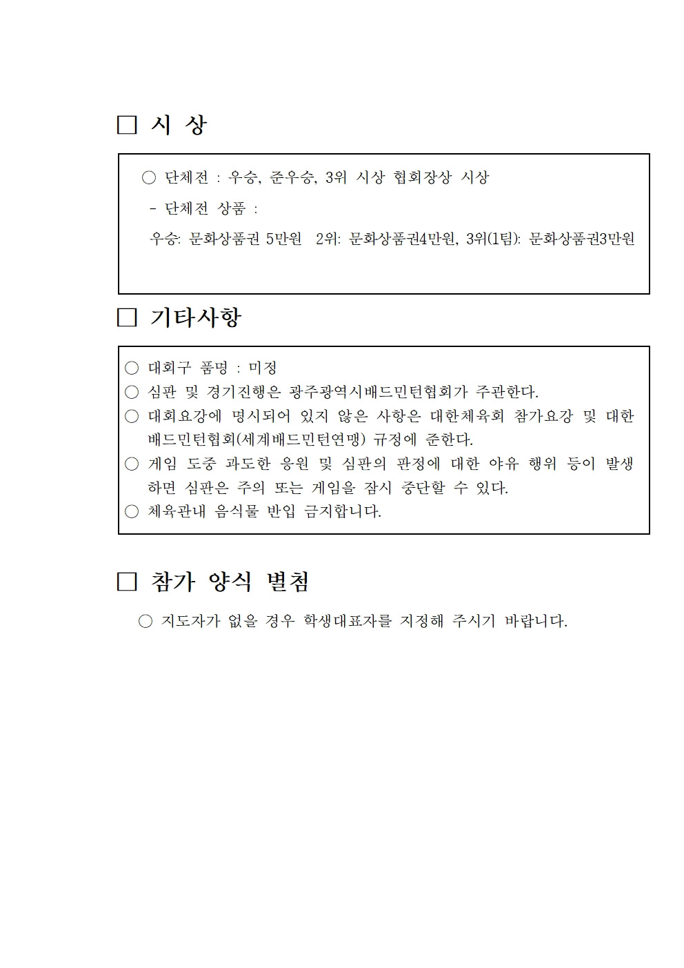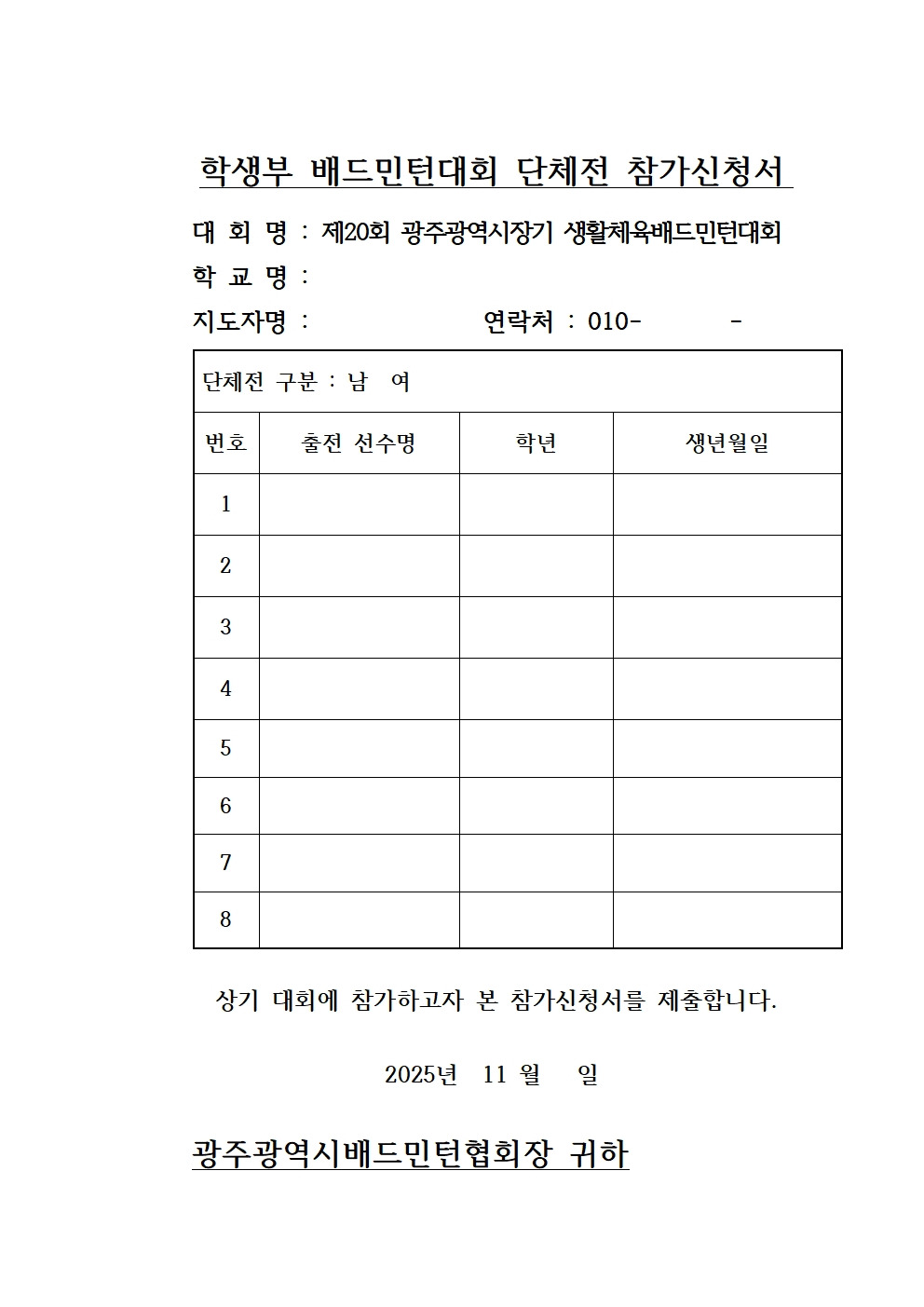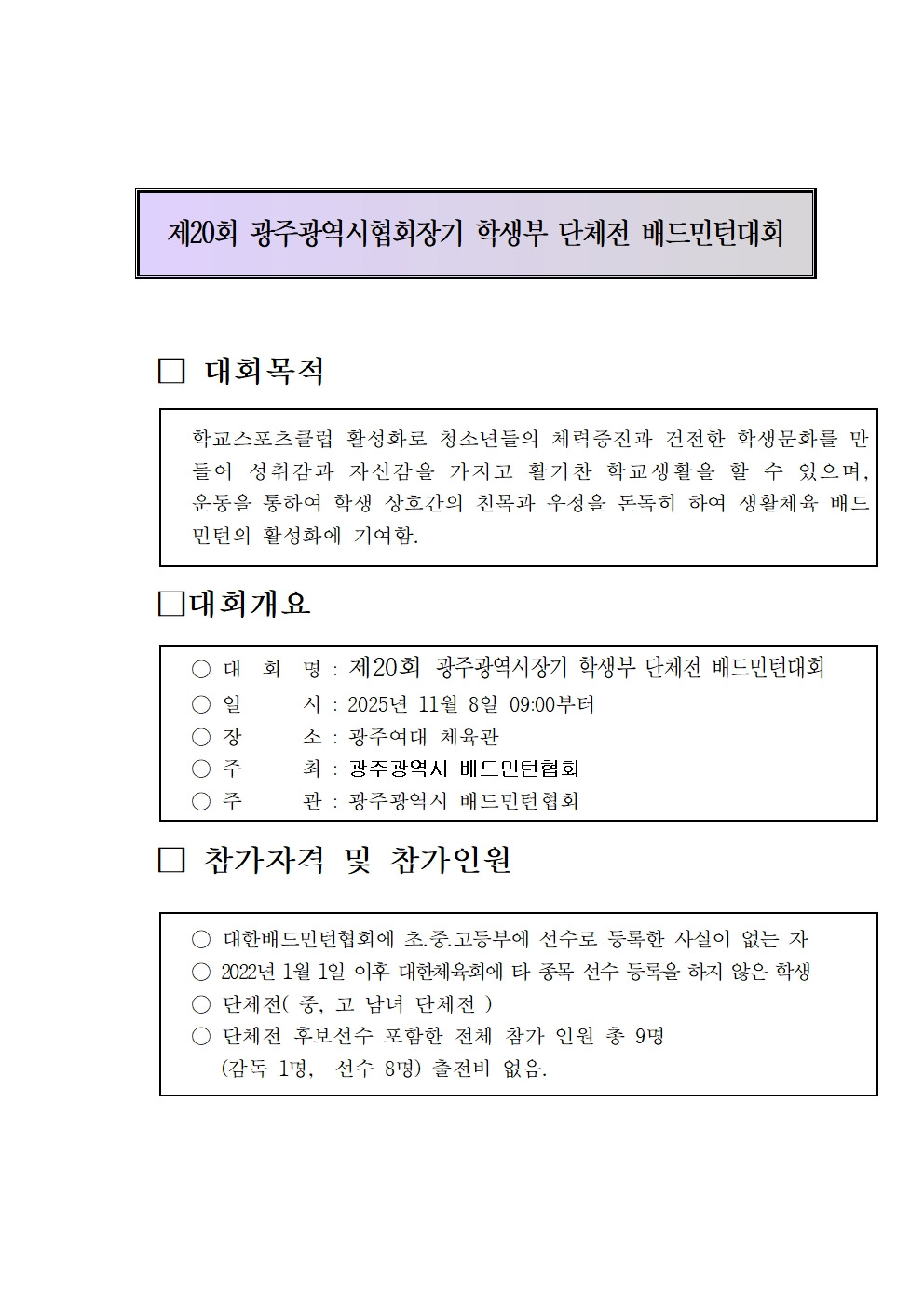 2025 제20회 광주광역시장기 학생부 대회 작성자신준승/광산구/송정|작성시간25.10.01|조회수332 목록 댓글 0 글자크기 작게가 글자크기 크게가 다음검색 현재 게시글 추가 기능 열기 북마크 신고 센터로 신고 댓글 댓글 0 댓글쓰기 답글쓰기 댓글 리스트
