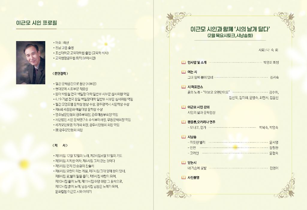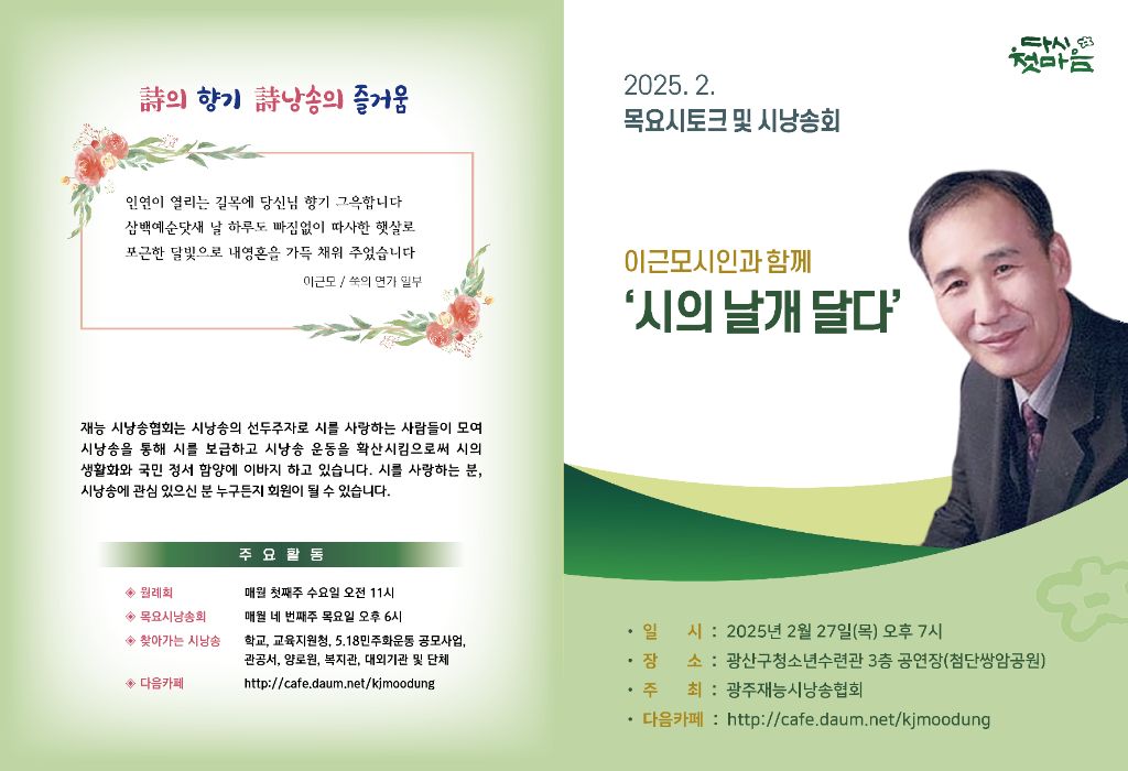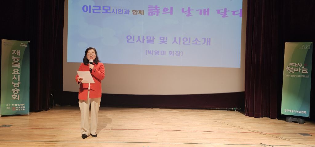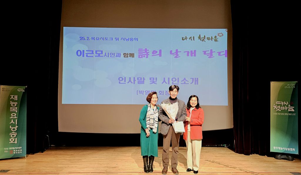 이근모시인과 함께 '시의 날개 달다'(2025.2.27) 작성자최민서|작성시간25.03.01|조회수60 목록 댓글 0 글자크기 작게가 글자크기 크게가 다음검색 현재 게시글 추가 기능 열기 북마크 공유하기 신고 센터로 신고 댓글 댓글 0 댓글쓰기 댓글 리스트