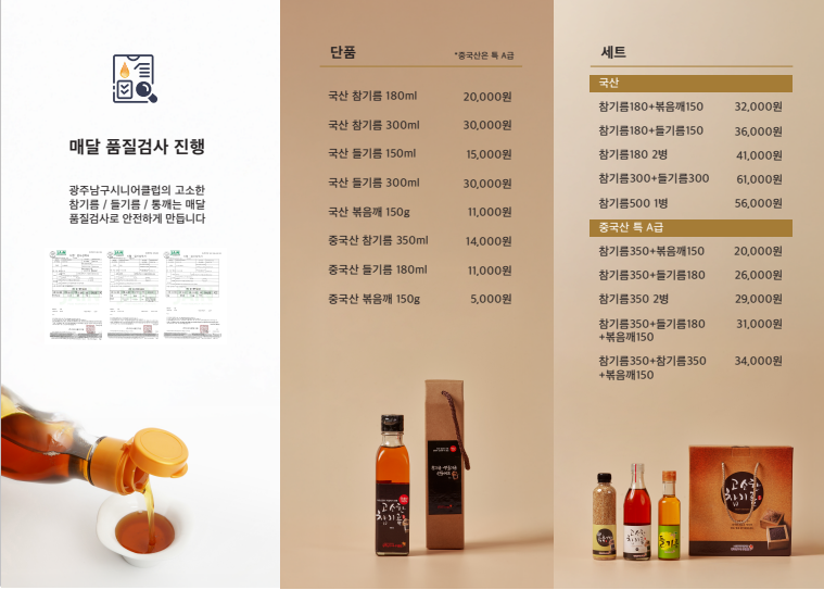 참기름 가격변동된 리플렛 소개합니다 작성자광주남구시니어클럽|작성시간25.10.17|조회수97 목록 댓글 0 글자크기 작게가 글자크기 크게가 참깨 가격인상된 가격으로 리플렛 새로 제작하였습니다일자리 어르신들의 정성으로 만들어진 참기름에 변함없는 관심과 사랑 부탁드립니다 다음검색 현재 게시글 추가 기능 열기 북마크 공유하기 신고 센터로 신고 댓글 댓글 0 댓글쓰기 답글쓰기 댓글 리스트