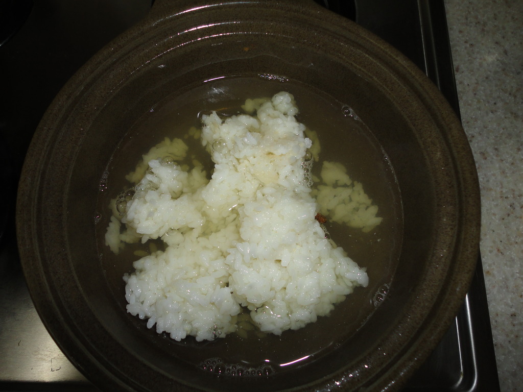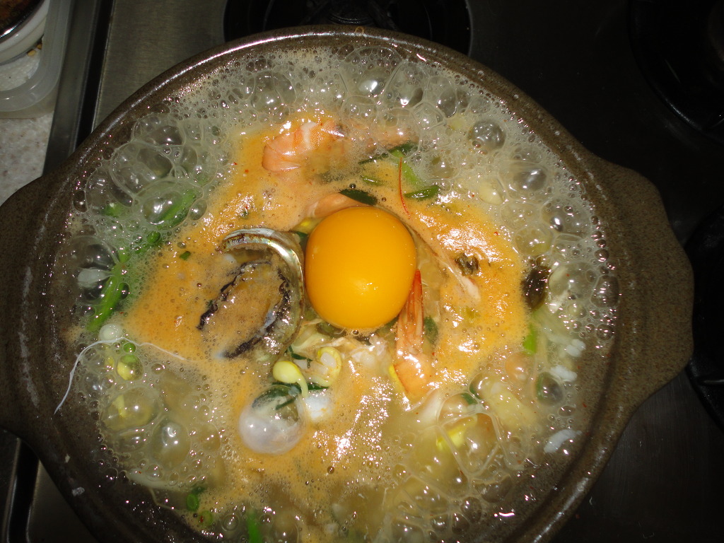 뚝배기에 밥을 삼분의이 되게 넣고 육수를 절반정도 넣은 다음...위의 콩나물을 듬뿍 올리고...